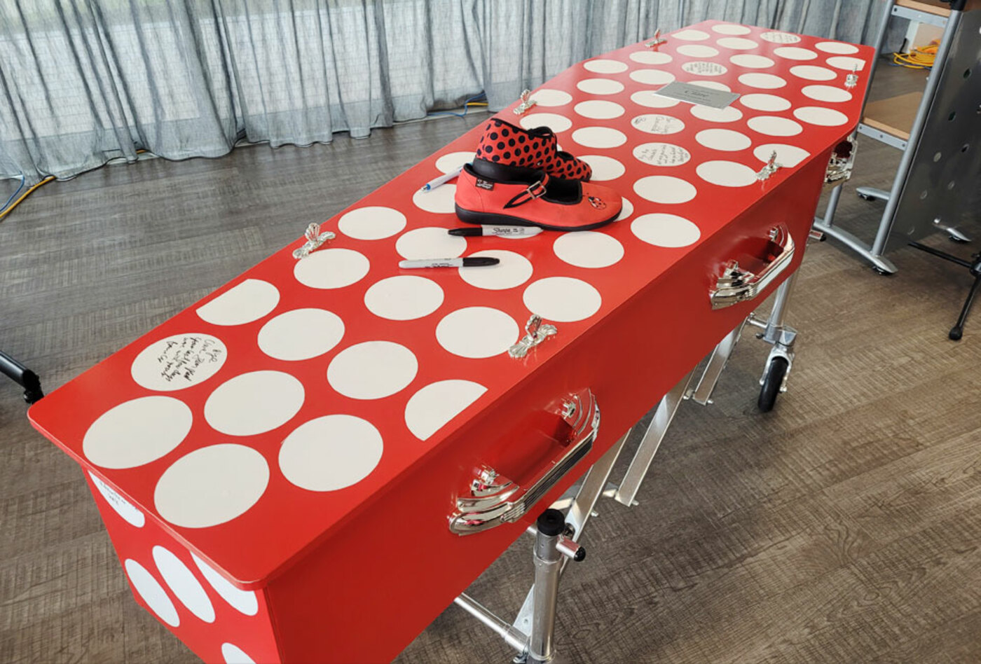 Mike and Marisa have many examples of people having done exactly this. One of the most poignant is of a father who died, leaving behind his wife and young children. His wife set up one of Carried Away’s plain MDF coffins in the garage on two wooden trestles, which her husband had no doubt used for home handyman jobs. She and the children spent the day decorating his coffin, creating for themselves a memory of making one final gift for this most important person in their lives. They adorned it with toy motorbikes, a pristine white baseball cap with his name on it, a family photo with Santa, hearts, rainbows, stars, small handprints covered in paint and pressed onto the surface, messages of love to him from